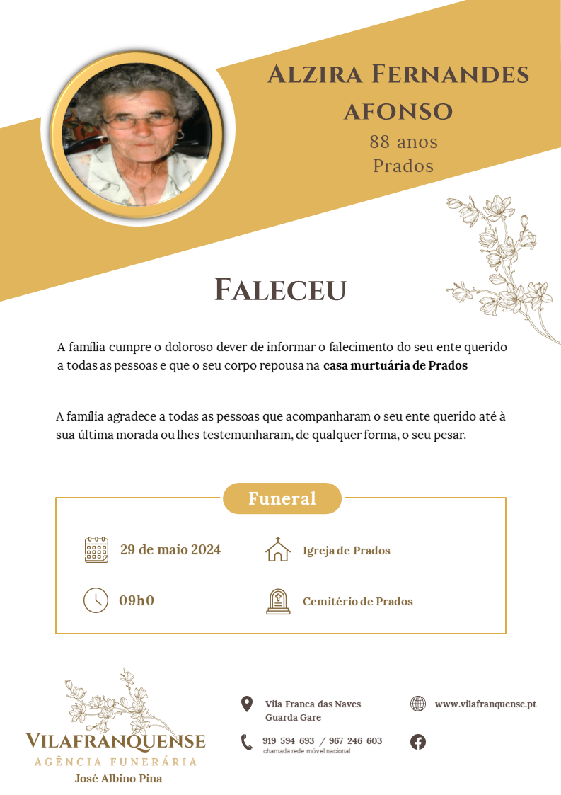 Alzira Fernandes Afonso 28 Abril 1936 - 27 Maio 2024 Idade 88 anos Residência Prados Velório Capela de Prados Funeral Igreja de Prados Cemitério Prados Obituario Voltar a Necrologia