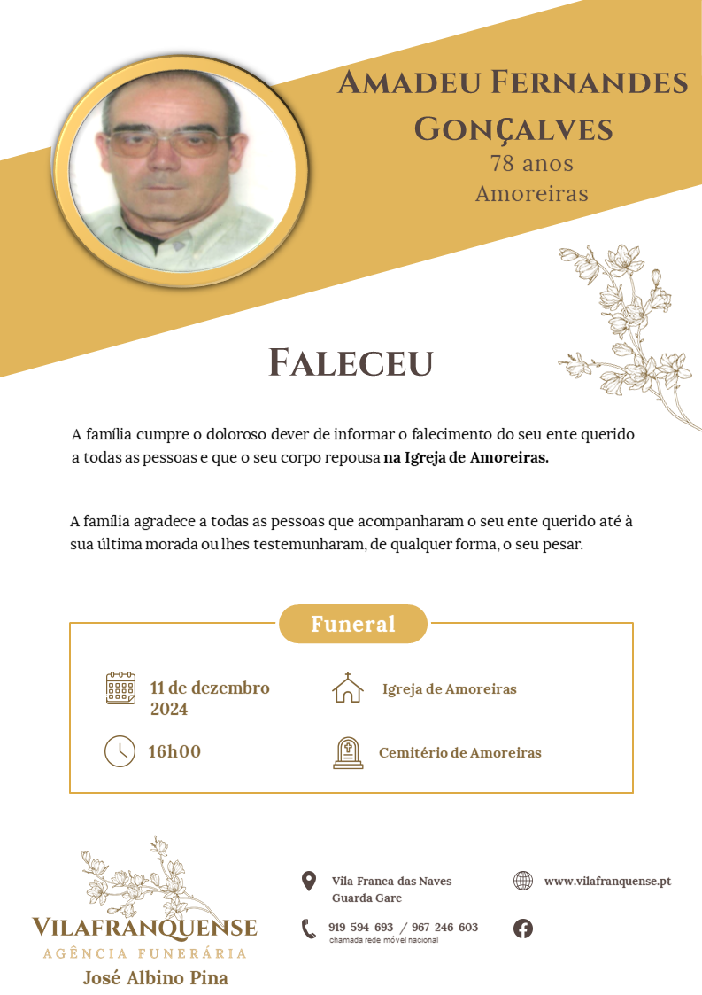 AMADEU FERNANDES GONÇALVES 5 Março 1946 - 10 Dezembro 2024 Idade 78 anos Residência Amoreira Velório Igreja de Amoreira Funeral Igreja de Amoreira Cemitério Igreja de Amoreira Obituario Voltar a Necrologia