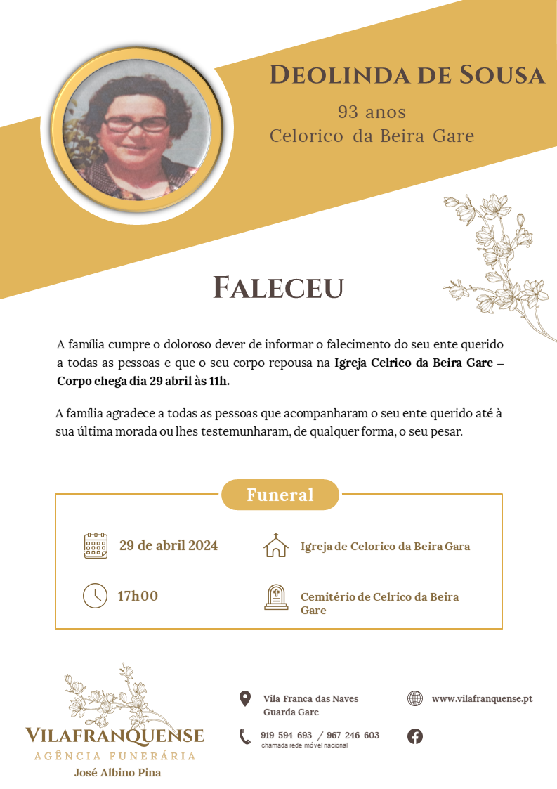 Deolinda de Sousa 18 Agosto 1930 - 28 Abril 2024 Idade 93 anos Residência Celorico da Beira Gare Velório Igreja de Celorico da Beira Gare Funeral Igreja de Celorico da Beira Gare Cemitério Celorico da Beira Gare Obituario Voltar a Necrologia