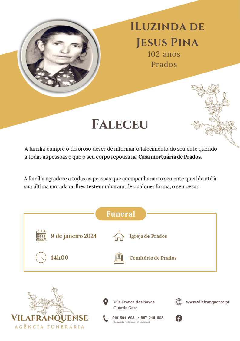 Iluzinda de Jesus Pina 5 Abril 1921 - 8 Janeiro 2024 Idade 102 anos Residência Prados Velório Casa Mortuária de Prados Funeral Igreja de Prados Cemitério Prados Obituario Voltar a Necrologia