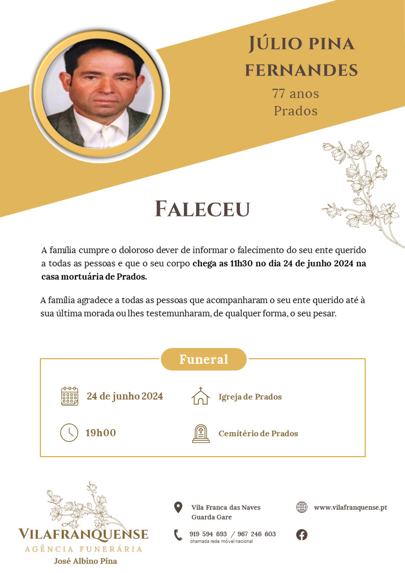 Júlio Pina Fernandes 1 Agosto 1946 - 23 Junho 2024 Idade 77 anos Residência Prados Velório Casa Mortuária de Prados Funeral Igreja de Prados Cemitério Prados Obituario Voltar a Necrologia