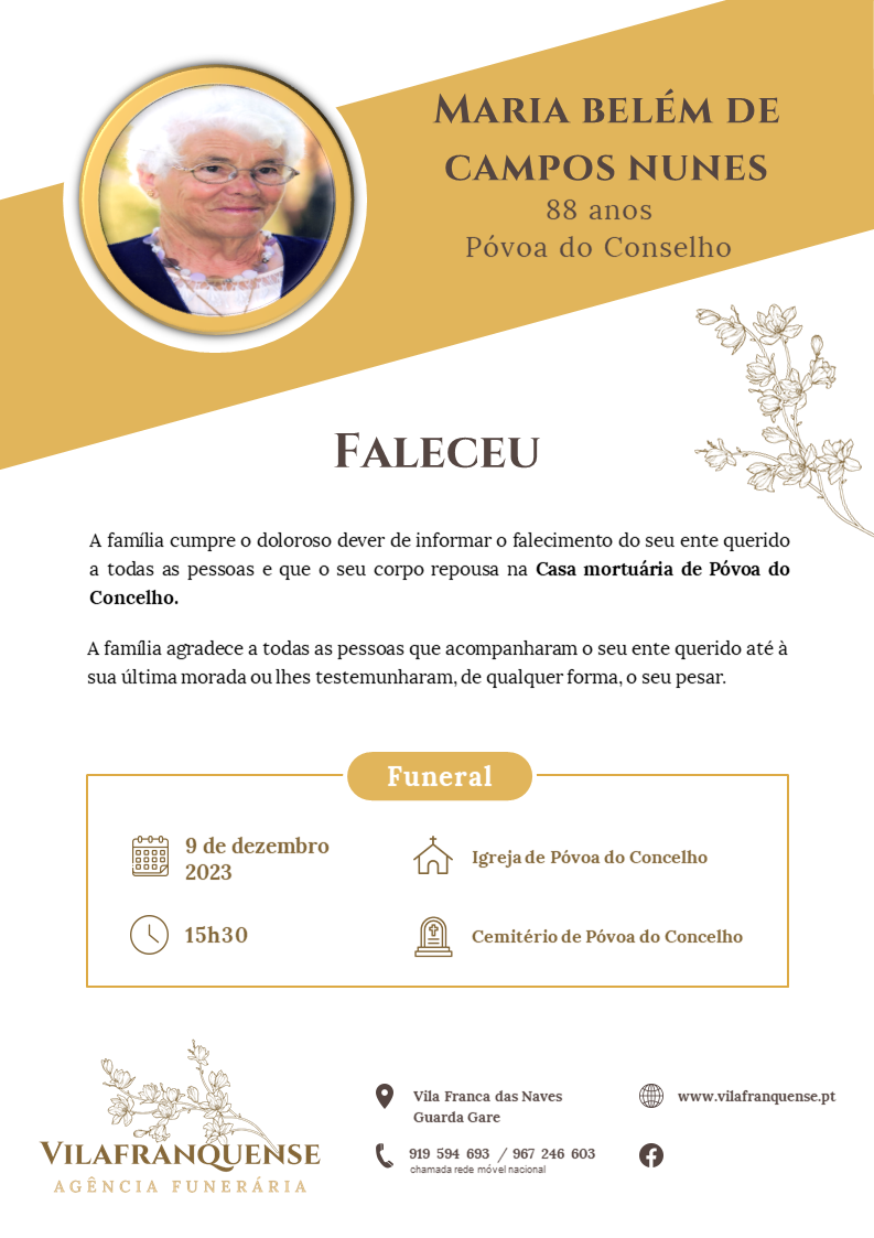 Maria Belém de Campos Nunes 15 Maio 1935 - 8 Dezembro 2023 Idade 88 anos Residência Póvoa do Conselho Velório Casa Mortúaria de Póvoa do Conselho Funeral Igreja de Póvoa do Conselho Cemitério Póvoa do Conselho Obituario Voltar a Necrologia