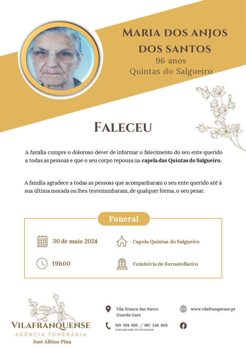 Maria dos Anjos dos Santos 20 Janeiro 1928 - 29 Maio 2024 Idade 96 anos Residência Quintas do Salgueiro Velório Capela Quintas do Salgueiro Funeral Fornotelheiro Cemitério Fornotelheiro Obituario Voltar a Necrologia